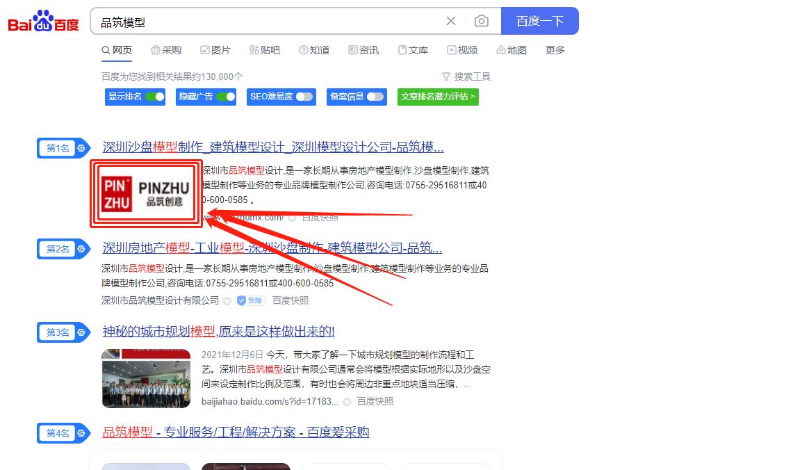 3、當站點logo權限開通并成功通過審核之后,我們會發現,在百度的搜索結果中,我的網站除了左邊出現我們網站的logo,搜索結果也從4行變成5行文字,外加121x75像素的logo面積,從概率學來講,展示頁面也提升30%。
