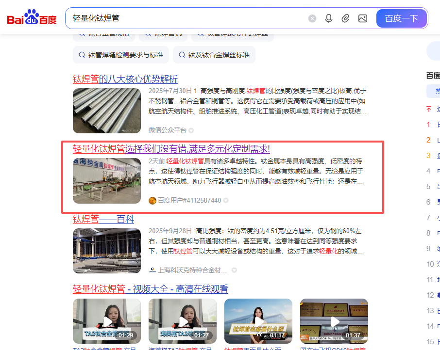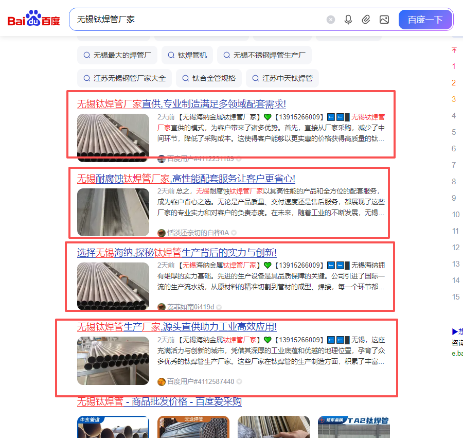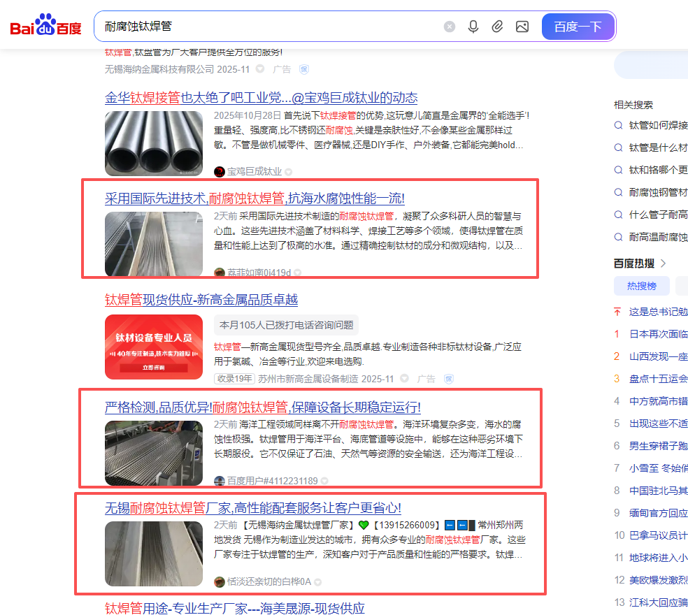 無錫海納金屬科技有限公司是一家專業從事高品質鈦焊管、鎳基合金焊管、超級奧氏體等材料的制品生產型企業。公司擁有多條高精度焊管生產線,制管口徑覆蓋Φ6-Φ108mm幾十種產品規格,公司選用國內優質鈦帶卷材,每批次材料入庫制管前必須通過公司實驗室理化性能、成分抽檢合格方可投產使用,焊管產品出廠前必須經100%嚴格的內外焊縫整平、精密焊縫跟蹤檢測、渦流探傷檢測、高壓氣密試驗、物理強度拉伸等品控試驗;產品對標符合GB、ASTM等相關標準的技術要求。海納公司常年輔以高校院所金屬材料及焊接工藝專業力量、研發技術支持,不斷創新和精益求精,力求滿足客戶的不同行業需求及高標準技術指標要求。公司產品自投入市場以來,深受新老客戶好評,被廣泛使用于石油化工裝備、核電火電能源、海洋船舶、海水淡化、水處理、航空航天、汽車、民用等領域;